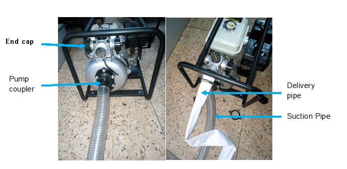 Insert the suction pipe on to the suction end coupler and tighten with an hose clip.